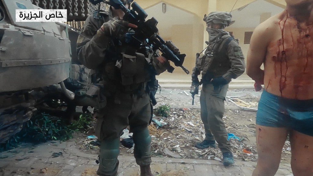تظهر مقاطع مصورة منفصلة معتقلين مدرجين بدمائهم بينما يتم تركيب كاميرات عليهم قبل أن يجبروا على دخول مبان لم يؤمنها الجنود بعد.